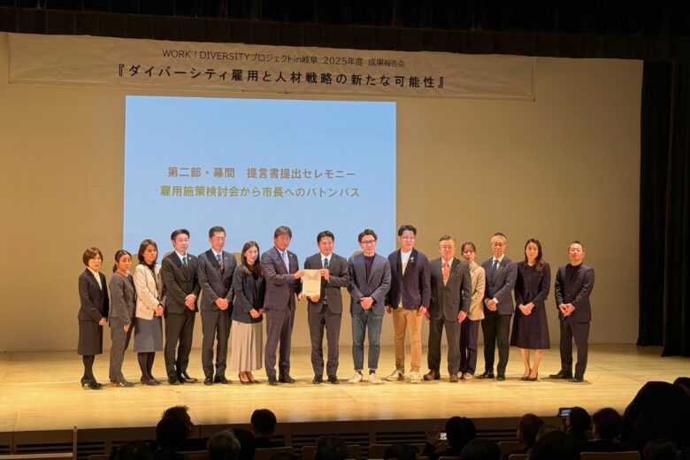 第三部では柴橋正直岐阜市長が登壇し、パネルディスカッションでまとめられた提言書を受け取りました。市長は、雇用施策検討会の議論に感謝を示し、「岐阜市として前向きに取り組む」と明言しました。提言書の中でも特に「企業への支援制度・優遇措置の拡充」と「ワークダイバーシティセンターの設置」を重要事項として挙げ、入札評価での加点措置など具体例を示しました。